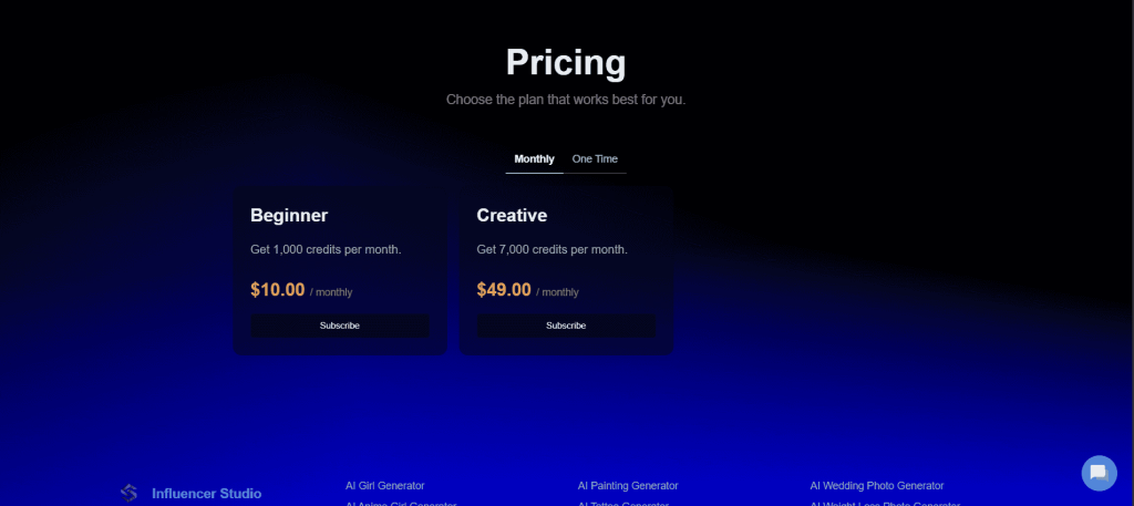 This plan offers excellent value for newcomers who want to explore AI influencer creation without a heavy investment.