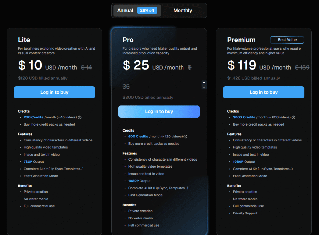You can also buy additional credit packs if needed. Annual payment plans offer 29% savings.