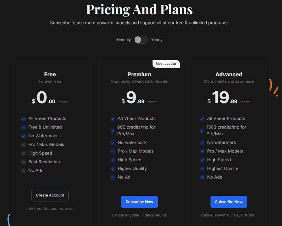 Unlike other AI platforms that rely on credit-based limitations, Vheer AI keeps pricing simple and accessible: