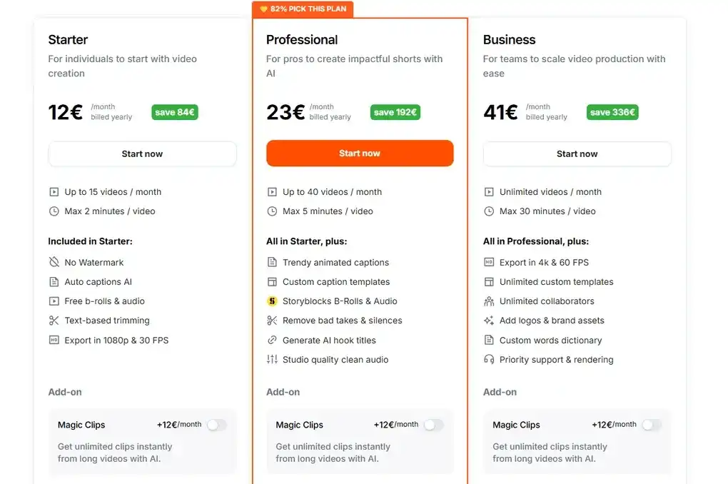 Submagic offers exceptional pricing compared to tools like Descript, Pictory, or Veed. With most features starting at just €12/month, it’s a smart investment for creators serious about content output and quality.