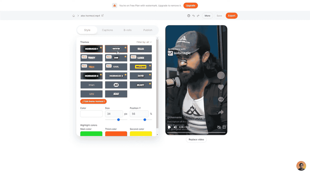 Submagic uses advanced speech recognition AI to auto-generate subtitles with high accuracy. You can select your spoken language, and the tool transcribes the dialogue into readable, synchronized captions. Each subtitle is editable, allowing for precise control over timing, font, size, color, and speaker labels.